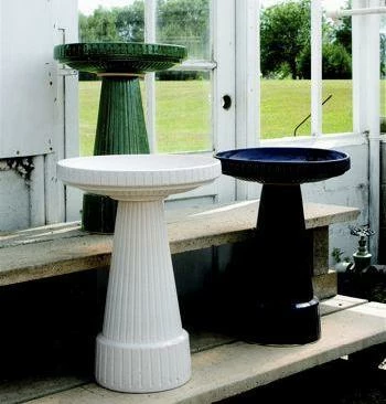 Durable glazed bird bath accommodates a bath heater in winter months when birds require a fresh water source most. Large diameter is also ideal for a solar fountain or bath dripper to agitate water in summer months.