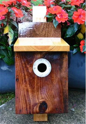 Features kerfs with “easy step” ledge inside to help nestlings when it’s time to fledge. Non toxic glossy stain preserves wood for many seasons of successful broods. Feathered friends will be cozy and safe in this traditional pine nest box.